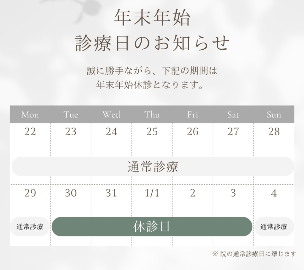 年末年始は、令和7年(2025年)12月30日(火)〜令和8年(2026年)1月3日(土)の期間は休診となります。